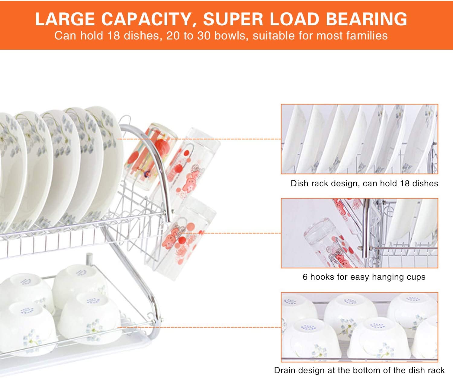 - Saving space: 2 tiers dish rack measures 41.5*25*37cm, keeps your tableware away from messy.